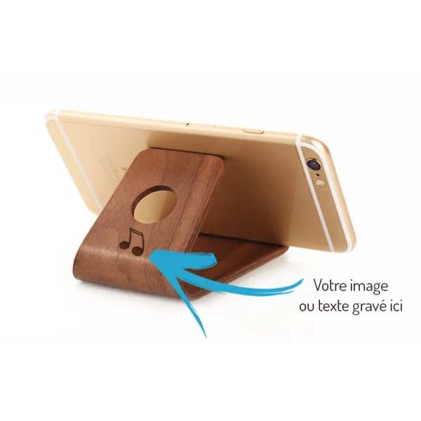Support smartphone en bois personnalisable gravureFaites graver votre support pour smartphone avec un logo, votre prenom, un texte ou l\'image de votre choix.