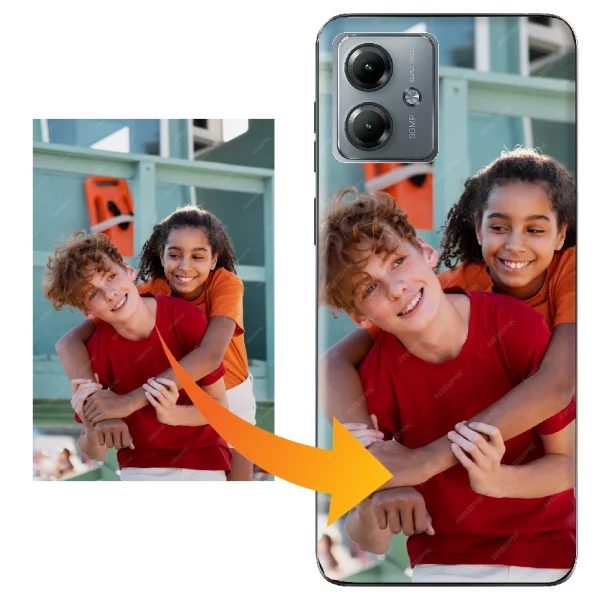 Création en ligne de coque silicone personnalisée Motorola G14 4G avec vos plus belles photos, images et texte. Livraison rapide.